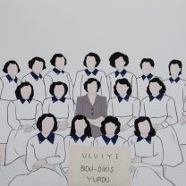 Young girls, who occupy an important position in the process of building the new nation with an “innocent and romantic” body language that is far from femininity, constitute the main source of Taşdan’s paintings. From the Girls’ Institutes (Kız Enstitüleri) to tailoring courses, from the Village Institutes to dance halls, girls, who were educated in every field and became the main symbol of the image of a modernizing Turkey, appear from time to time through the holiday rituals in our collective memories. Taşdan highlights the stereotypical characteristics of young girls starting from the first phase of the Republican regime, her aim is not to project a nostalgic longing, but to question the meaning of nostalgia in a national context: To re-evaluate the hopes of the past through the lens of the present while looking at the realized and unrealized dreams of the Republican ideal.
